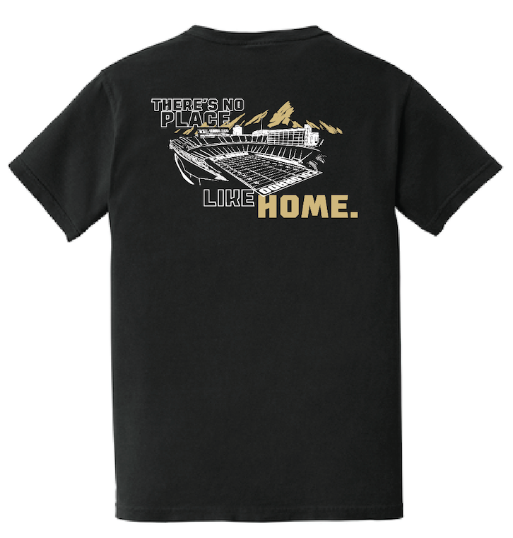 Show your Buffs pride with a classic Comfort Colors pocket tee that’s all about Boulder spirit. The front keeps it simple with a gold “Sko” script on the pocket, while the back brings the energy with a bold stadium graphic and the words “There’s No Place Like Home.”